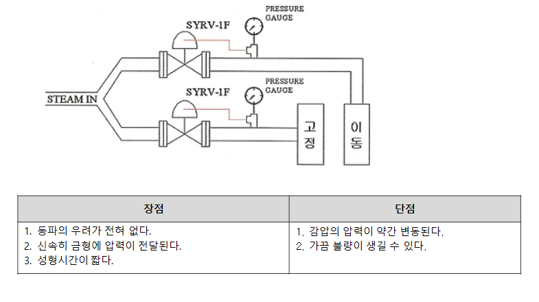 - SYRV-1F형은 성형시 필요한 압력을 빠른 시간내에 투입시키고 완벽한 유량으로 제품을 생산할 수 있어 스팀장애로 인해 일어날 수 있는 불량율을 최소화시킨다.