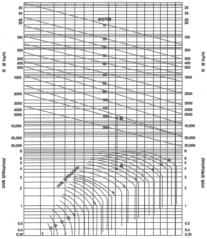 2) B점이 호칭경(지름) 125A와 150A 사이에 있으므로 호칭지름 150를 선정해야 배관라인에 무리가 없다.