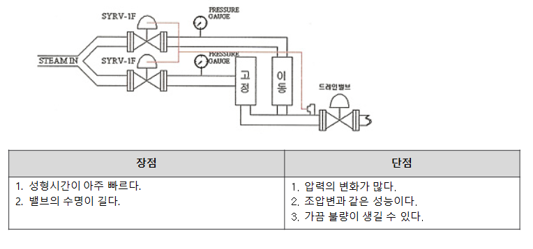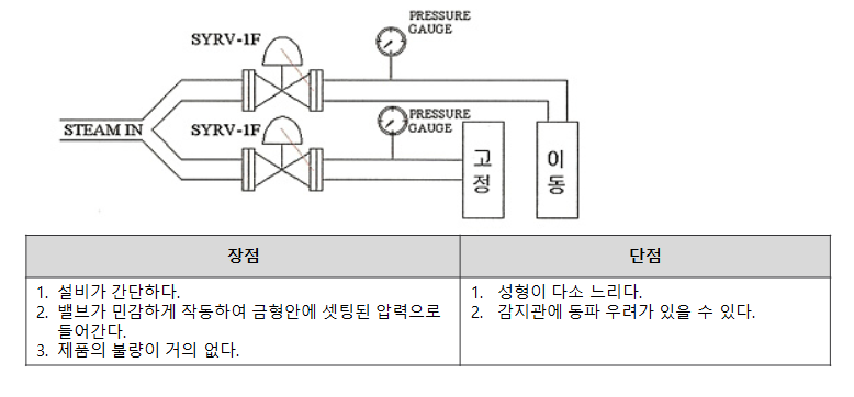 - SYRV-1F형은 성형시 필요한 압력을 빠른 시간내에 투입시키고 완벽한 유량으로 제품을 생산할 수 있어 스팀장애로 인해 일어날 수 있는 불량율을 최소화시킨다.